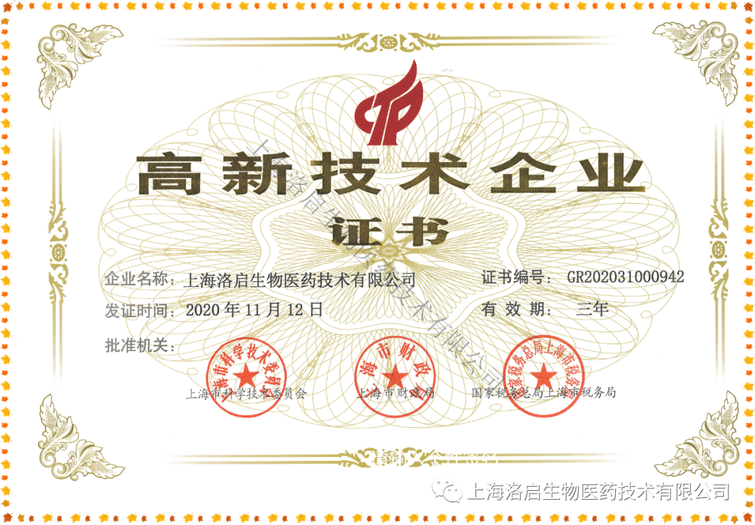 近期,上海公海555000官网生物医药技术有限公司取得了由上海市科学技术委员会、上海市财政局、国家税务总局上海市税务局联合颁发的“高新技术企业证书”。