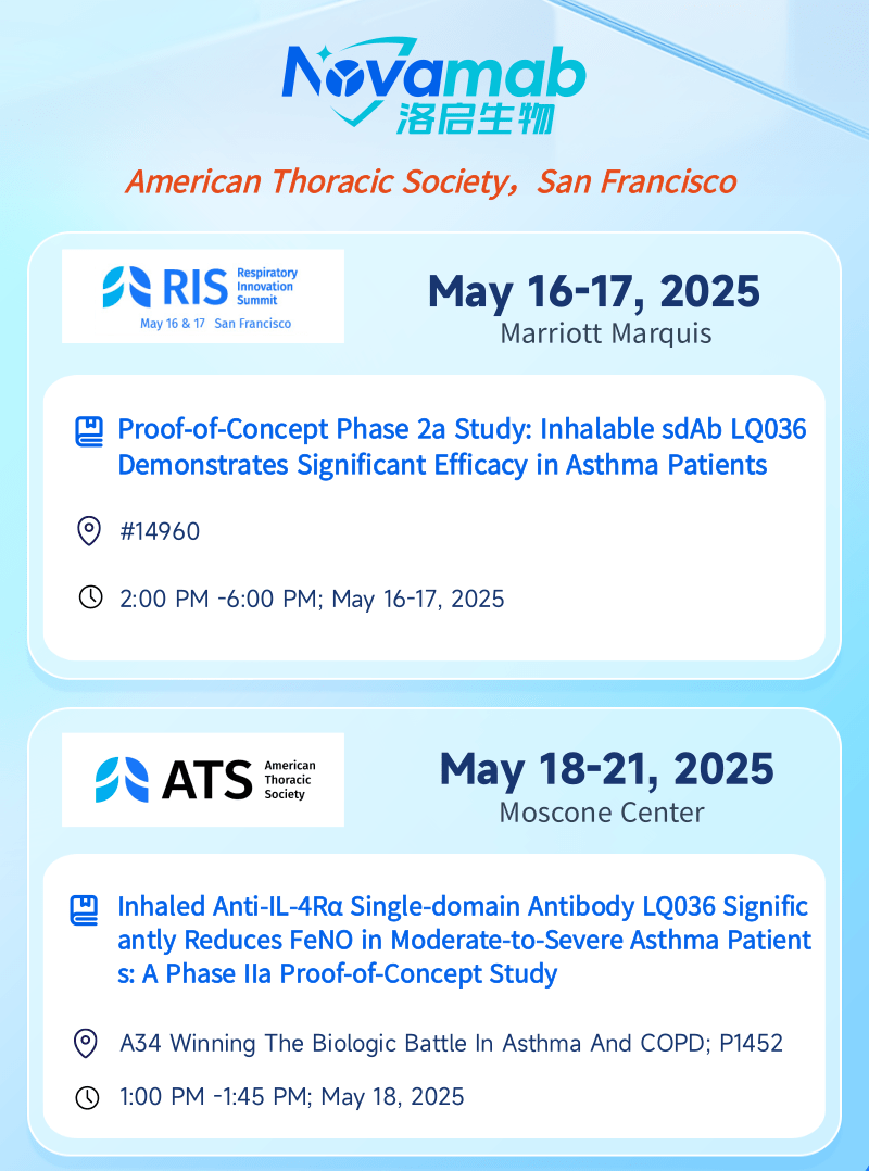 中国上海,2025年5月13日——上海公海555000官网生物医药技术有限公司,一家专注于纳米抗体创新药研发的生物技术企业,今日宣布:公海555000官网生物将于当地时间5月16日至21日赴美国加州旧金山,受邀参加美国胸科学会(American Thoracic Society, ATS)主办的呼吸创新峰会(Respiratory Innovation Summit,RIS)及ATS国际大会。届时公海555000官网生物将分别在RIS和ATS两场大会上以壁报形式呈现最新临床数据——公司自主研发的靶向 IL-4Rα 吸入性生物制剂 LQ036 首个 IIa 期概念验证性临床试验数据。本次展示将全面披露 LQ036 在中重度哮喘患者中的安全性、耐受性、药效指标及初步疗效,标志着公海555000官网生物在下一代呼吸道吸入式生物制剂开发领域迈出关键里程碑。